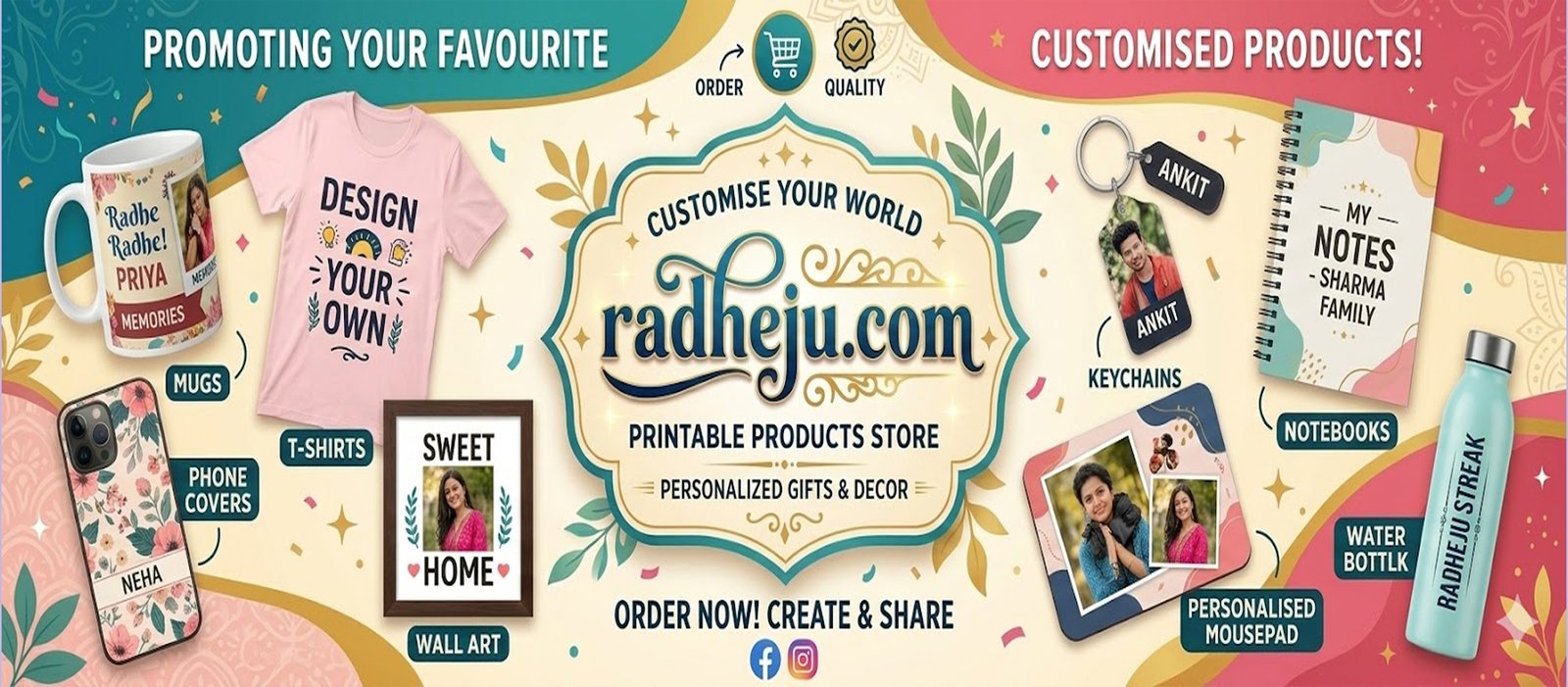 At Radheju.com, we believe the true treasures of life are not things, but the memories we create and the bonds we share. Our journey began with a simple dream—to make gifting more than just an exchange of objects. We wanted to turn every smile, every moment of love, and every celebration into something you can hold close forever.                         That’s why we create personalized gifts that speak from the heart. From glowing photo frames and crystal lamps that light up your memories, to custom lifestyle apparel and elegant décor, each piece is crafted with care and meaning. We are not just selling products—we are helping you celebrate love, family, and togetherness in the most beautiful way.
